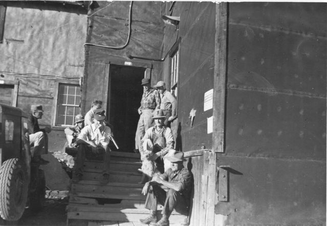 The picture to the right shows some of the Summitville miners in front of our building. Ray is the short man with a light cap standing in front of the window. Schmitte sits at the bottom of the steps. (The guy sitting on the Jeep is a company man visiting for the day. Dirk not present.)
