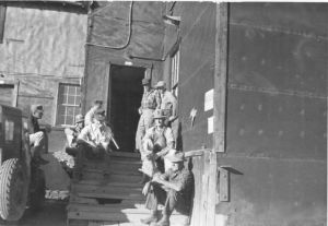 One Sunday Dirk decided to go fishing. He was told of a great place across a pass from our home. So I took him up to the pass and showed him the large quaking bog at the top. When we walked out to the middle on apparently solid ground and I began to jump up and down, waves spread out marking the edge pretty clearly. After warning him to avoid the area on his way home, he drove the jeep to the fishing stream and I turned back home. The fishing was so good that Dirk did not start back until it was getting dark. Recall that he was fearless; so he thought Theodore is too cautious so I will take the direct route over this perfectly flat area. About 200 feet in the jeep broke through the surface. Dirk rescued his trout and walked back to a good supper. The company had equipped these jeeps with lots of special equipment so we knew we had to retrieve it, but we could do nothing at night. After breakfast all 14 of us gathered equipment that we thought might be useful and went up to the edge of the bog in the other jeeps. Fortunately the front bumper of the jeep had caught on a big piece of wood, so we quickly attached a long cable and secured it to a large tree growing at the edge of the bog.
