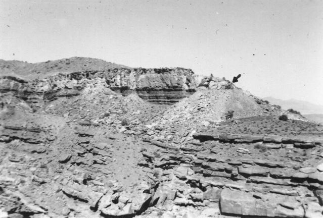 I had probably gone about 5 miles when I heard a vehicle coming up behind me. Of course it stopped when I put out my thumb. The beat-up pick-up truck held one old prospector. He was friendly and as soon as I said where I was headed he agreed to take me. I had already taken in that he was holding a fifth of something (rum, as it turned out). When I got in I was pleased to see that it was almost empty. I stressed that he only needed to take me to the bottom of the cliff.