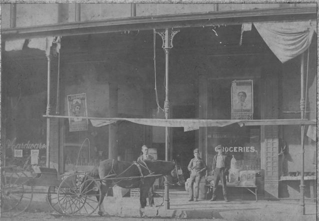 1895 Ernest Jesse Palmer standing behind his father's team of horses ready to deliver groceries in Webb City, Missouri