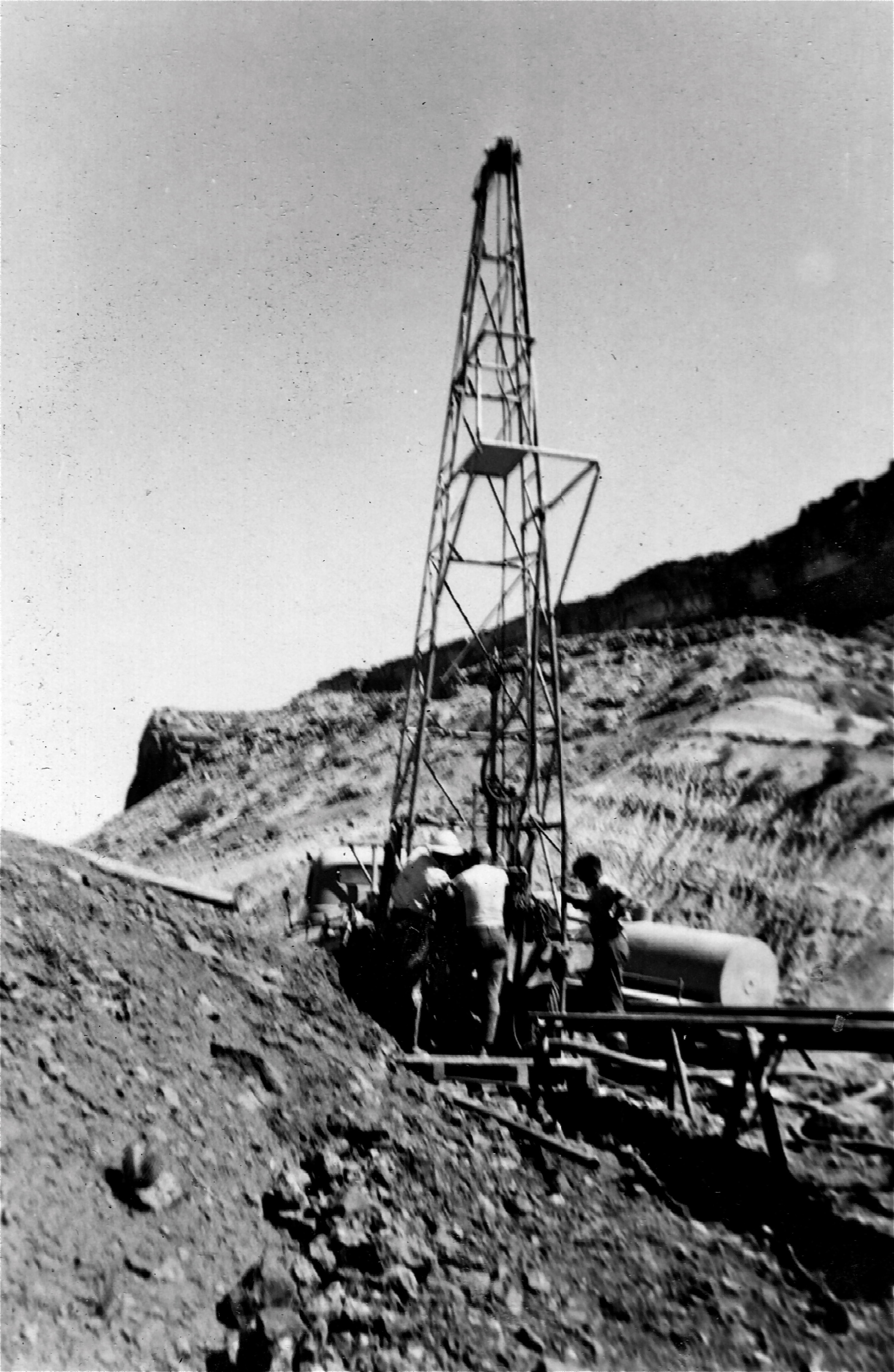 A drilling rig at Four Aces Claim in August 1955 with the sloping Chinle shale mostly hiding the tall Wingate cliffs of Copper Point. (Most crews had one driller often in his 20s and two teenage kids. The latter often liked to shoot at the common, tiny (6 to 10 inches long and under 1/2 inch diameter) sidewinders. Since we all wore boots this shooting was much more dangerous (bullets fly off rocks in surprising directions) than the snakes themselves. They are only dangerous when you sleep on the ground. They may slide into your sleeping bag to escape the cold desert nights and if you role over a bite in the wrong place could easily be fatal.